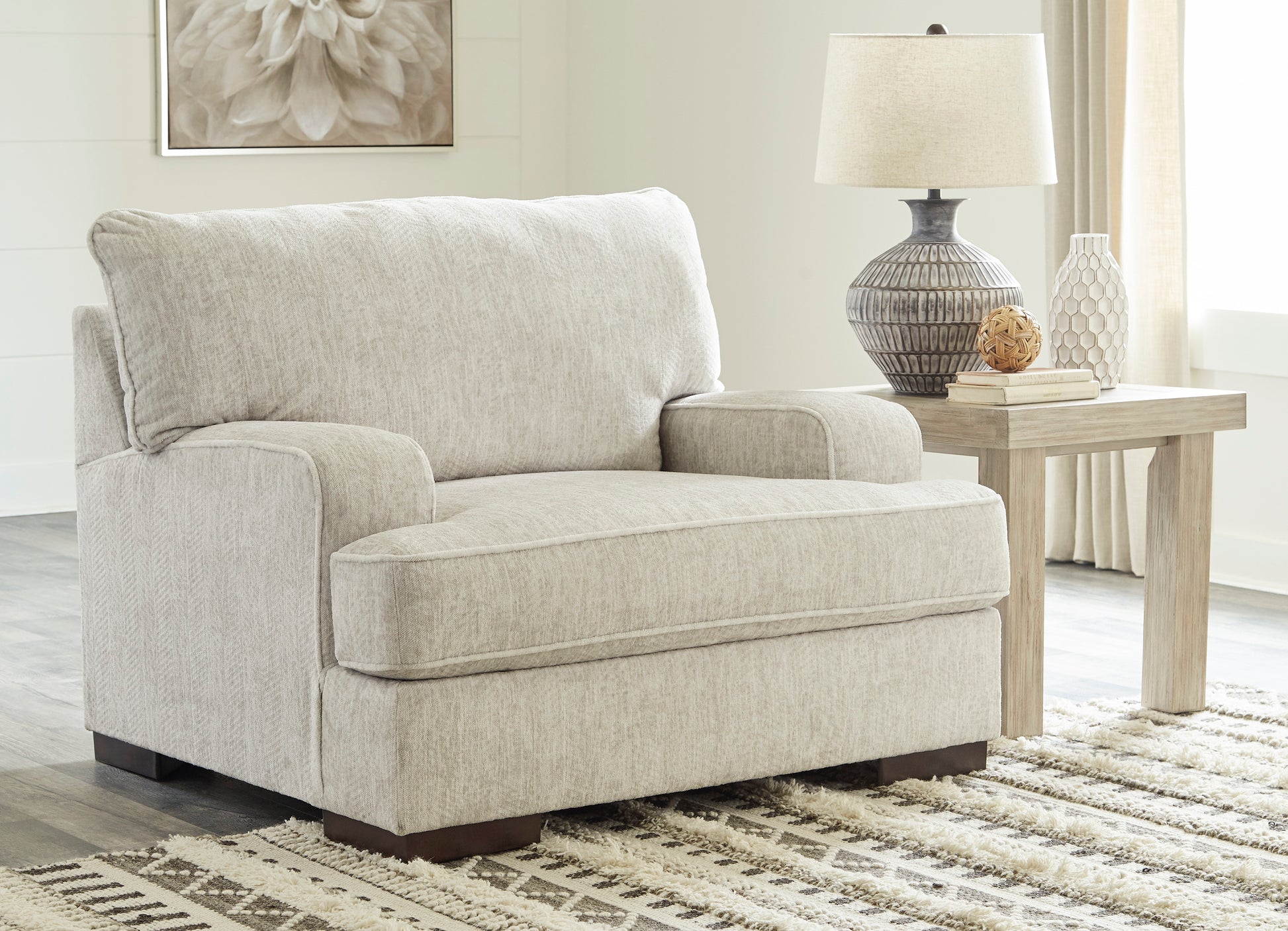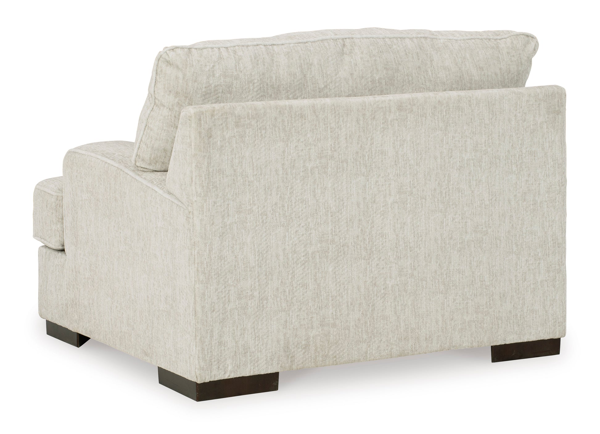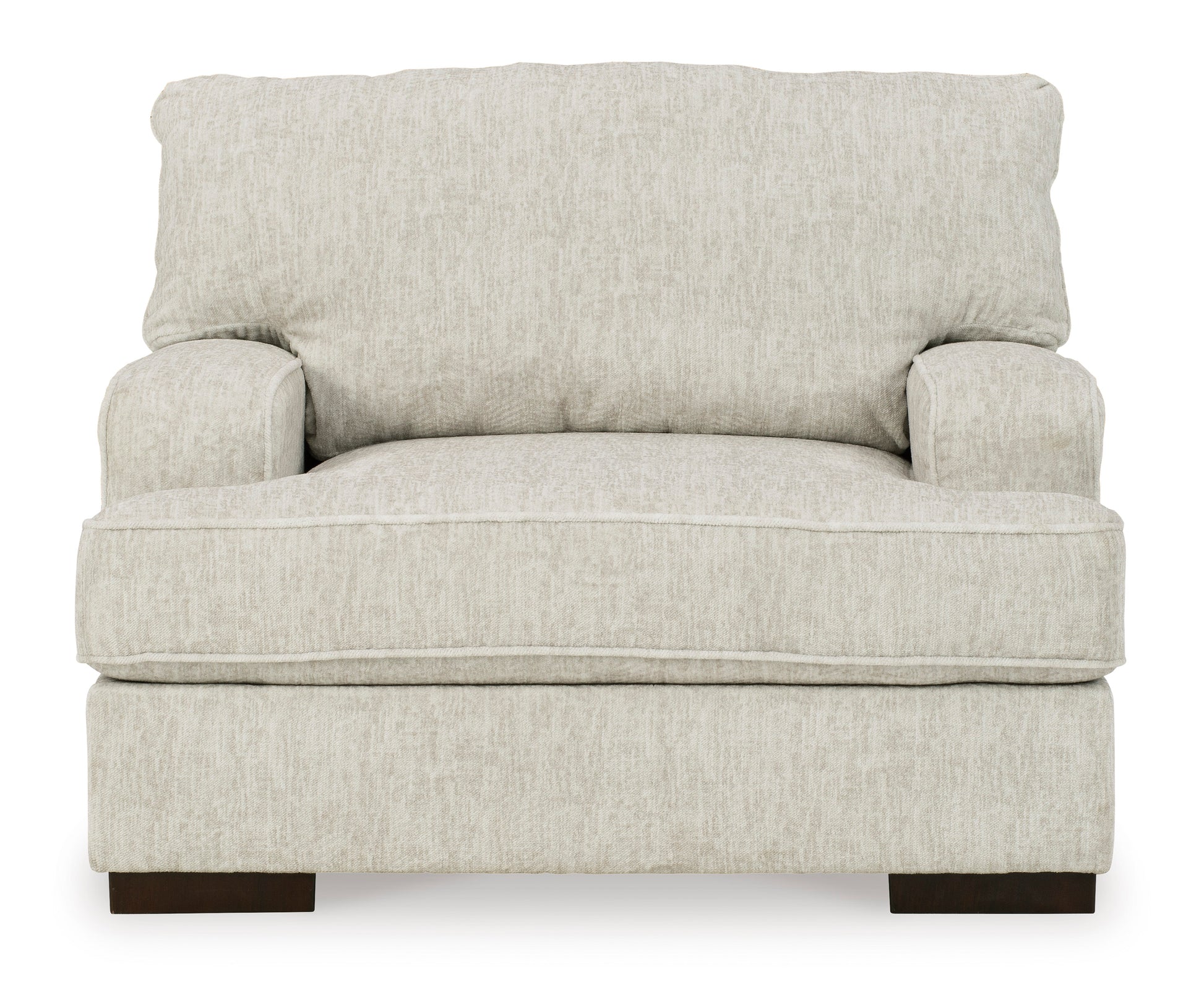 Decidedly modern with a sense of relaxed ease, the Alesandra oversized Chair looks at home in so many different places and spaces. Providing a highly distinctive look: substantial track arms with curved cornering, wrapped t-cushioning and low-to-the-floor block feet in a warm wood-tone finish. Sporting a subtle chevron texture, the parchment-tone upholstery takes neutral to new heights.Corner-blocked frame