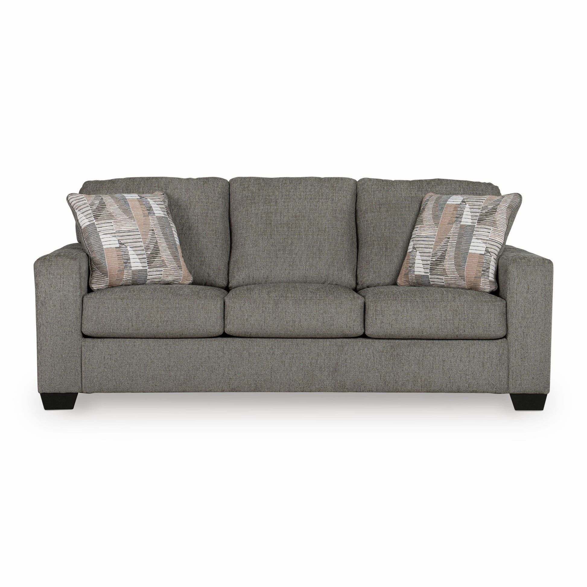 You’re in for a neat treat with the Regal comfort sofa. Its comfy seats are covered in soft, textural upholstery, and the wide track arms are eager to support your quest for total relaxation. Distressed abstract toss pillows bring a fresh breath of contemporary style while accentuating the sofa's color.Corner-blocked frame