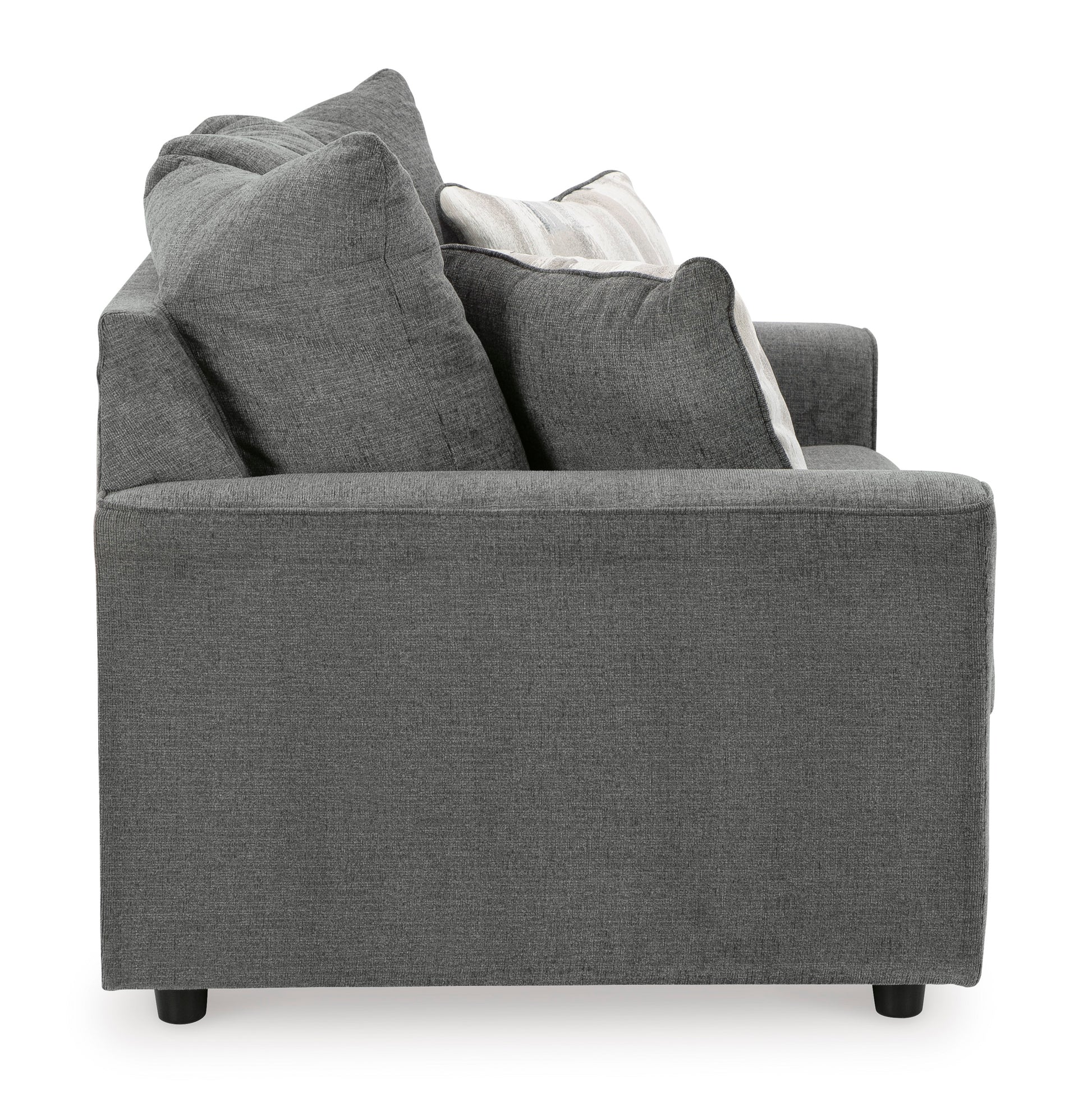 What€™s new in neutrals? Shades of gray, of course. Embrace this sophisticated design trend with the gorgeous Stairatt Loveseat, which offers a clean-lined, contemporary style at a comfortably cool price. Sure to lift your spirits, the plush chenille fabric is fabulously neutral. Modern flared arms give it a distinctive flair. This Loveseat also arrives with two cool brushstroke accent pillows to elevate the taste and comfort level.Corner-blocked frame