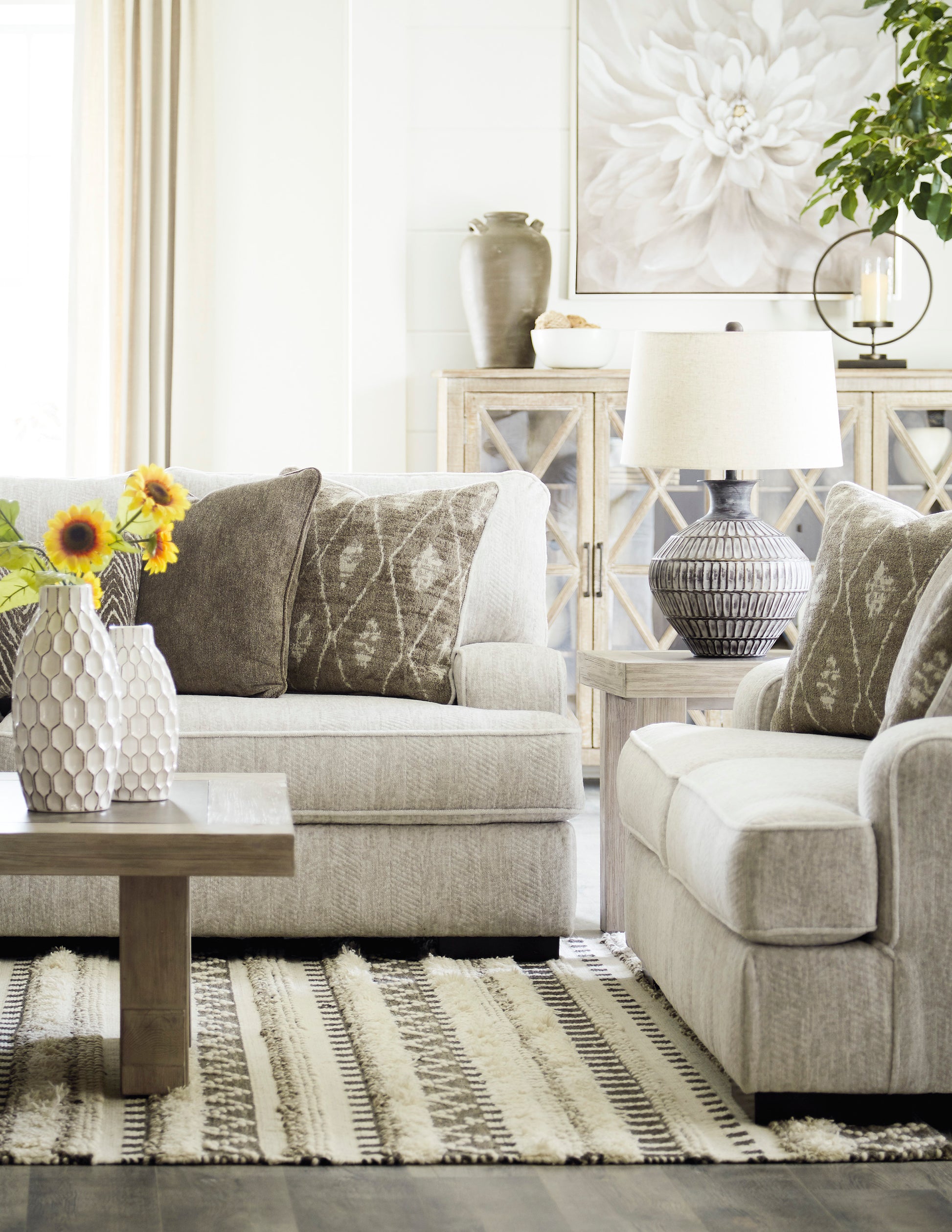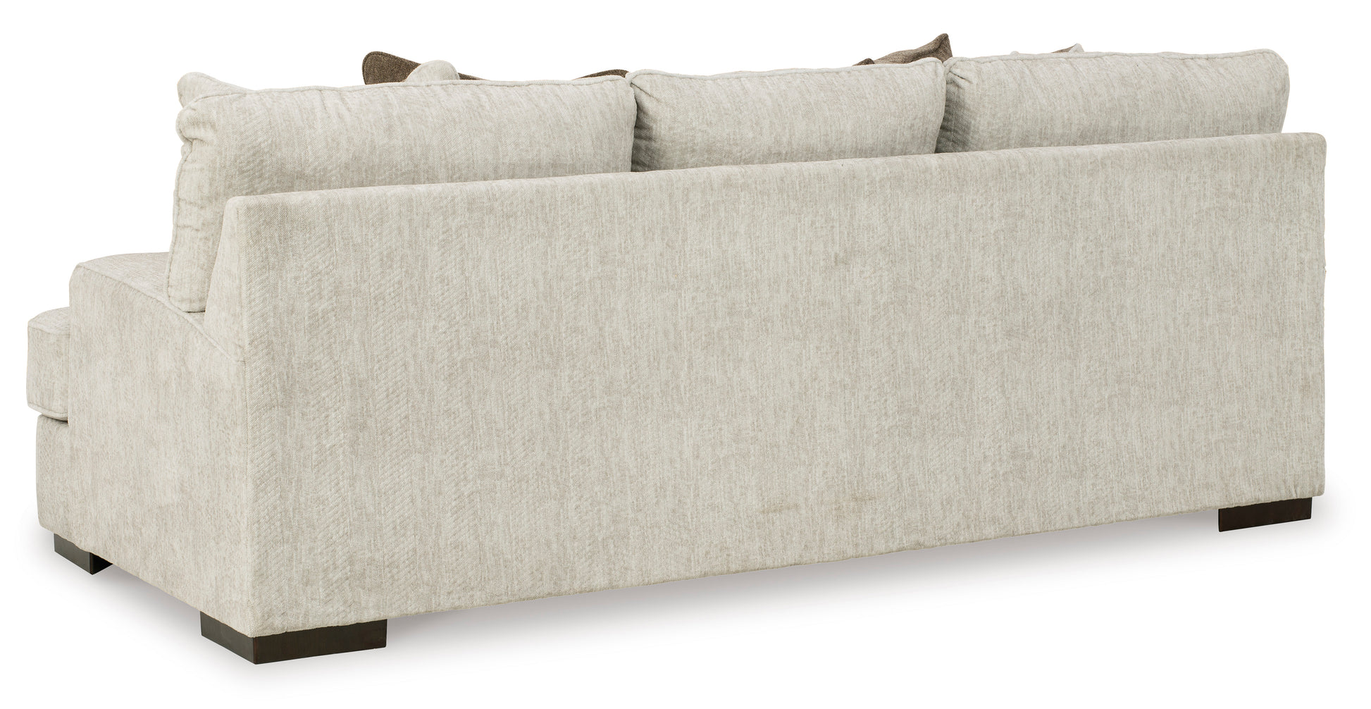 Decidedly modern with a sense of relaxed ease, the Alesandra Sofa looks at home in so many different places and spaces. Providing a highly distinctive look: substantial track arms with curved cornering, wrapped t-cushions and low-to-the-floor block feet in a warm wood-tone finish. Sporting a subtle chevron texture, the parchment-tone upholstery takes neutral to new heights.Corner-blocked frame