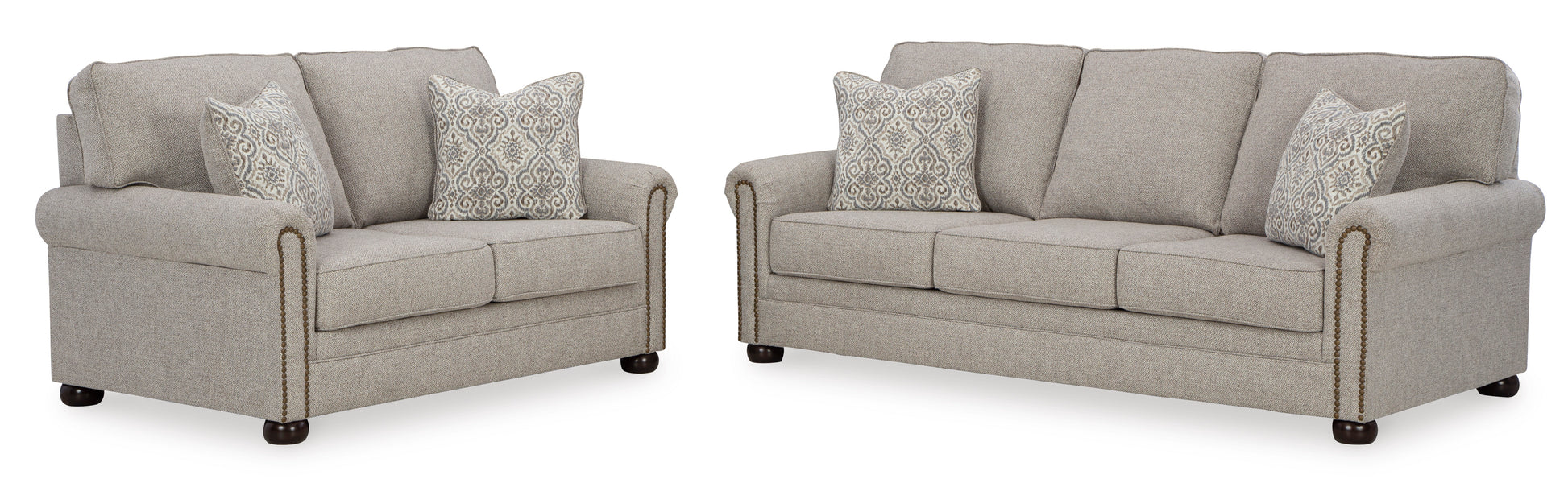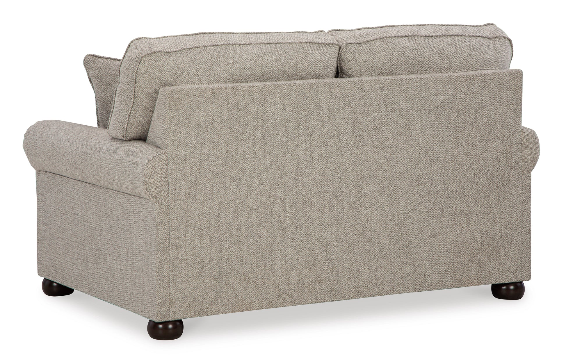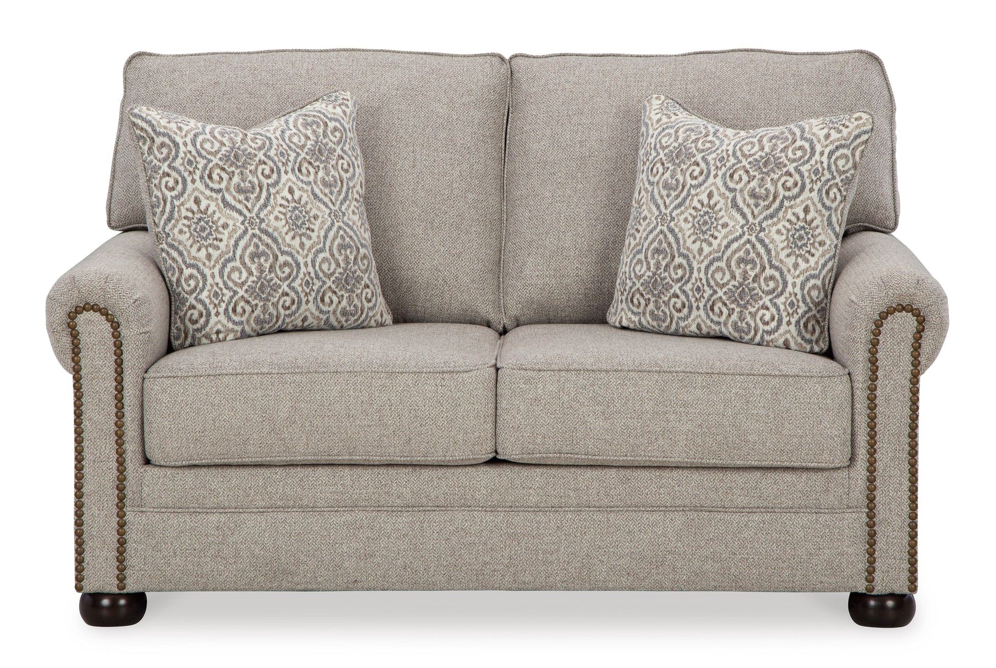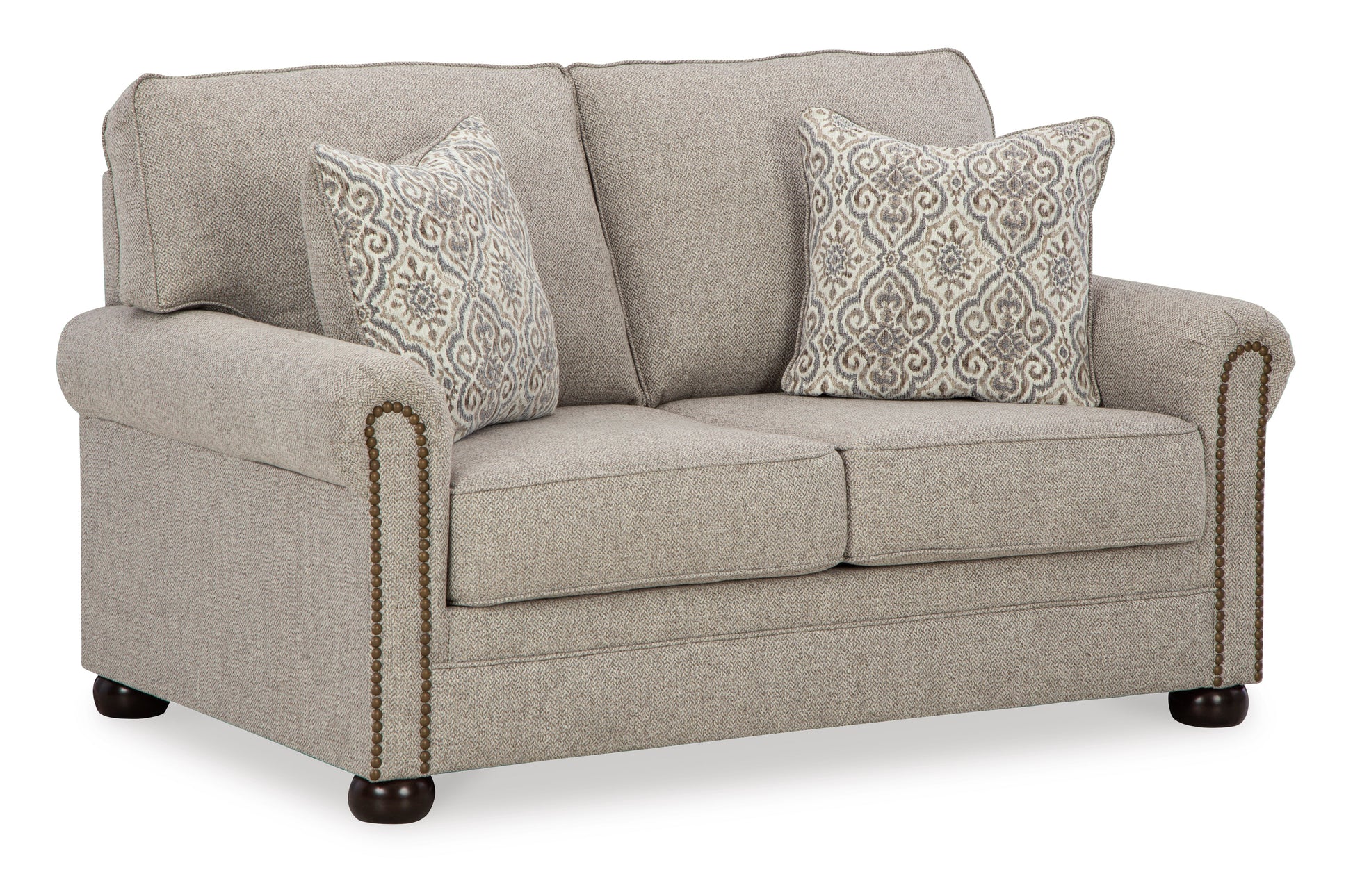 Inspired by the past but rooted firmly in the present, the Gaelon Loveseat complements your transitional seating area. Its versatile upholstery is delightfully detailed for a subtle herringbone effect. Designer touches like decorative nail head trim and bun legs add traditional character. With this Loveseat's reliable style and comfort, all you need to do is sit back and relax.Corner-blocked frame