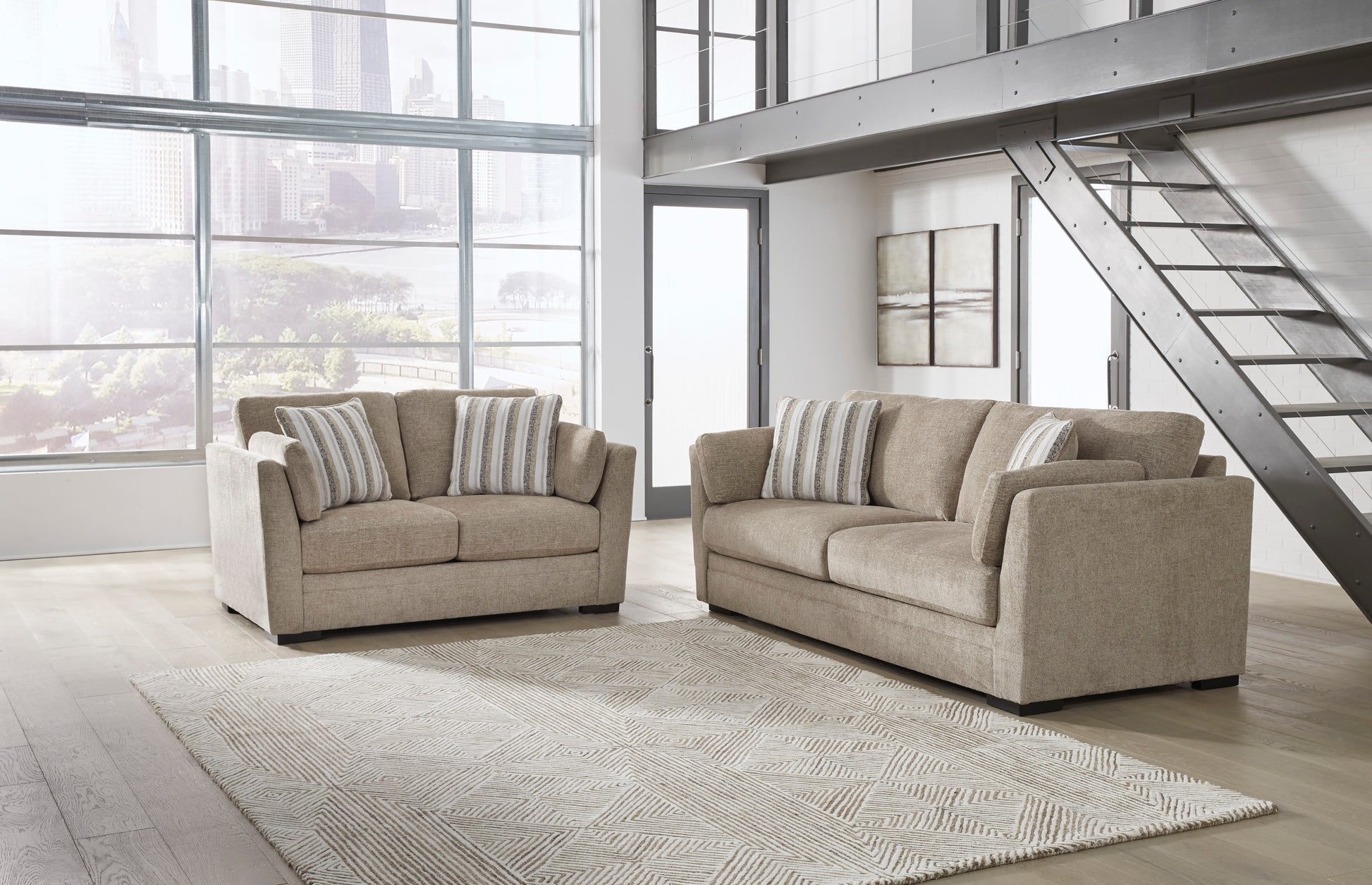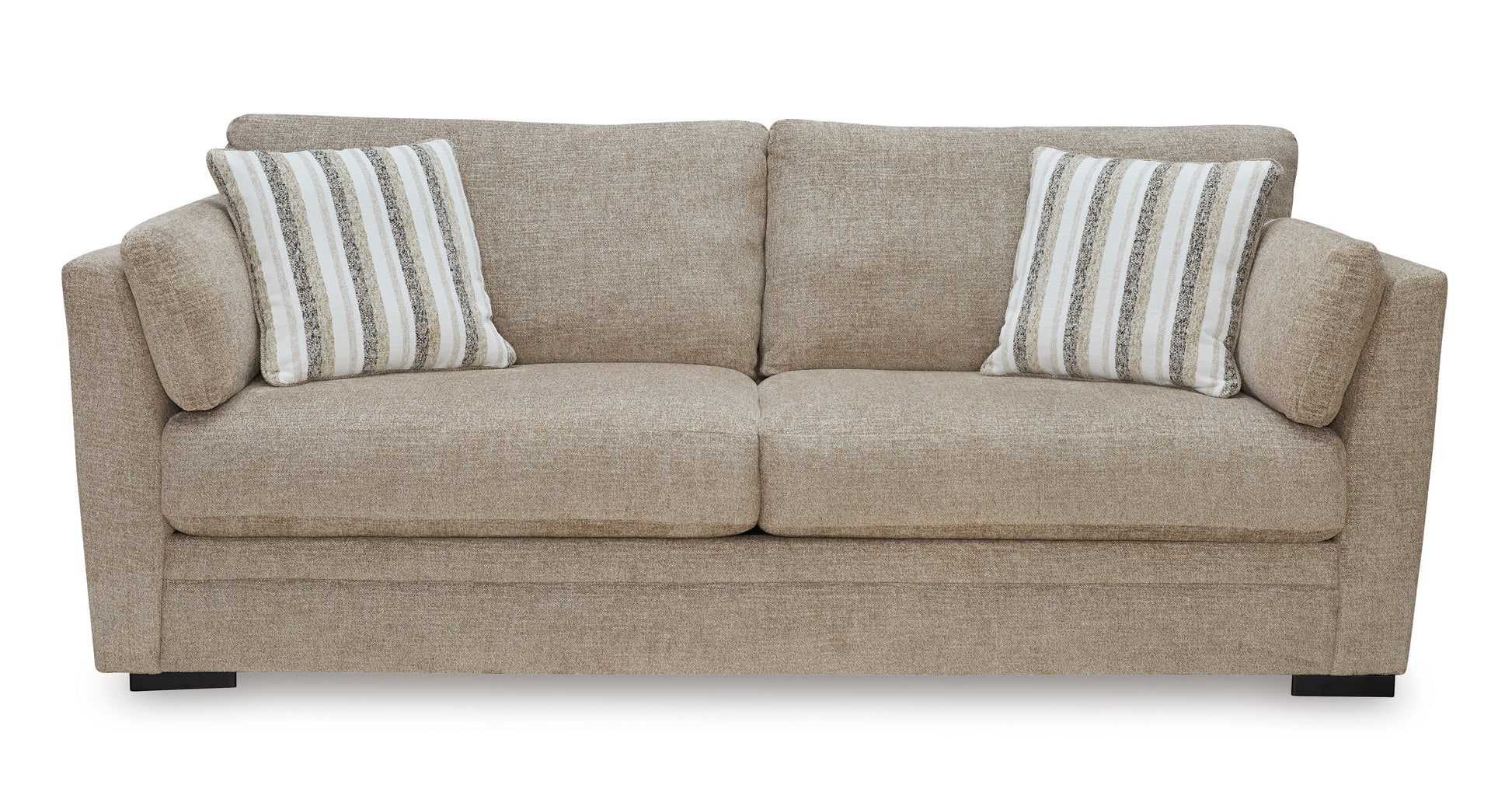 Looking for the perfect blend of decadent comfort and contemporary flair? You've gotta check-out this sofa. With its plump cushions, plush chenille fabric and softly tapered arms, this piece makes it easy to lounge solo or with a friend in stunning style. Arm bolster pillows and striped accent pillows are icing on the comfort cake.