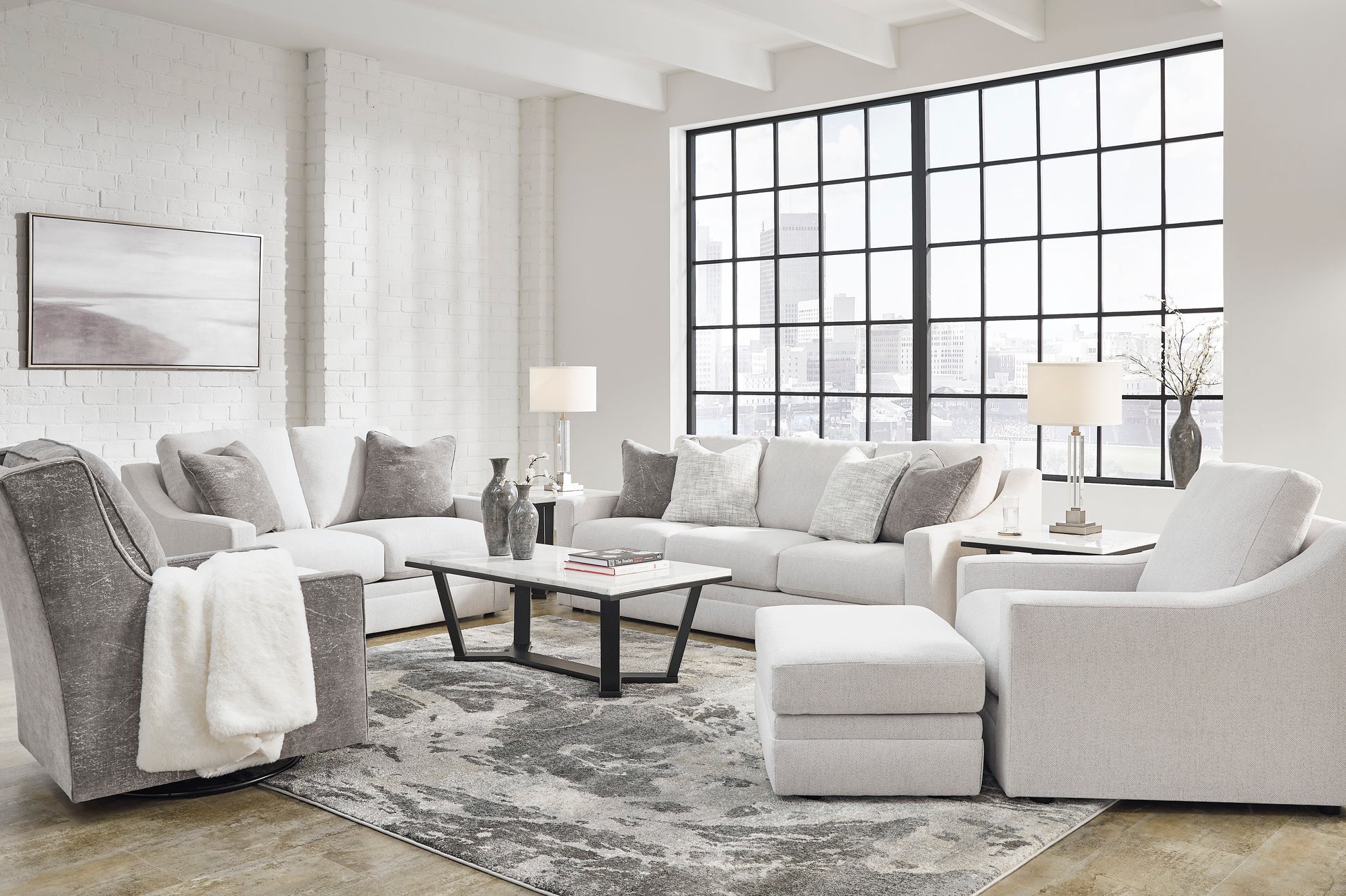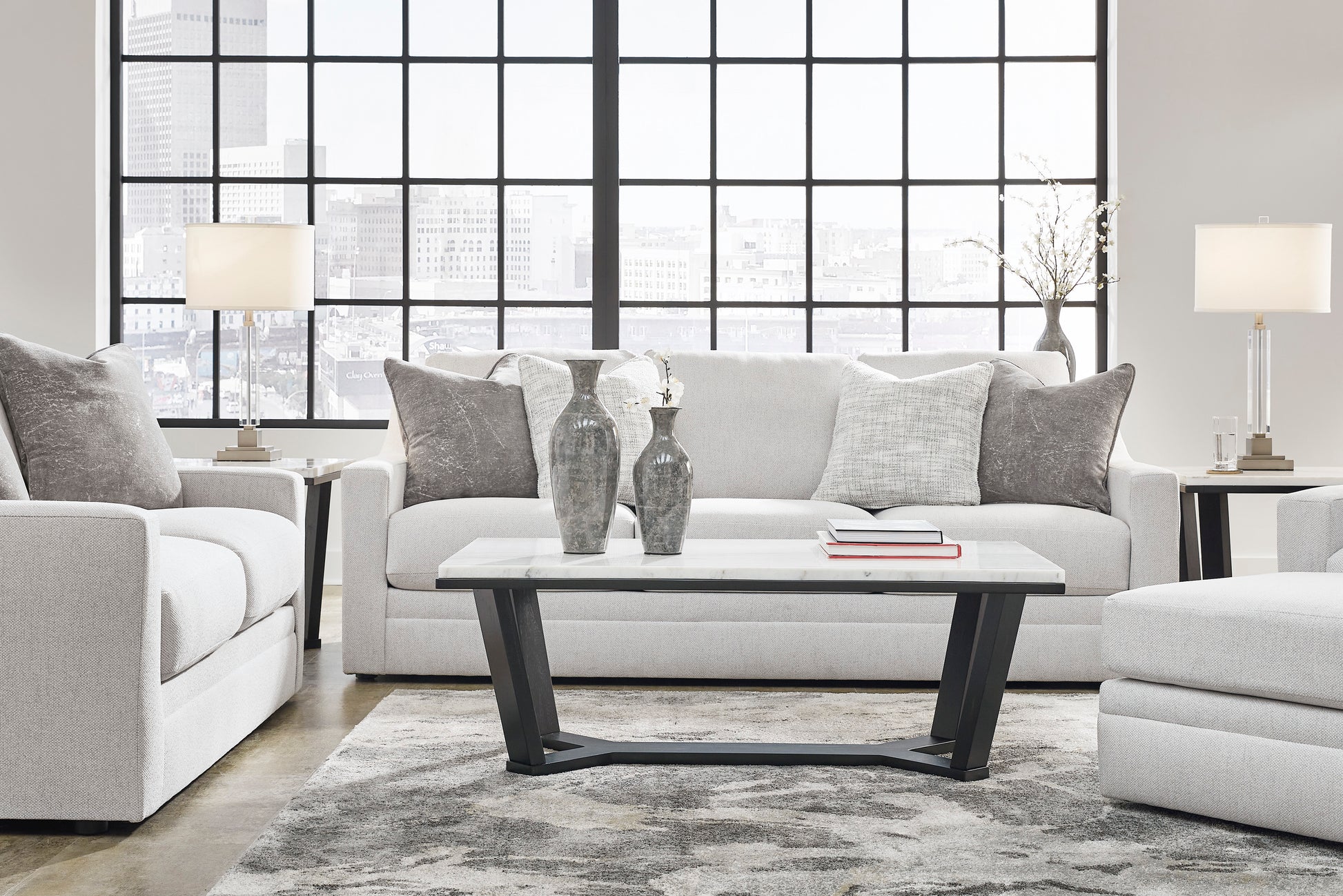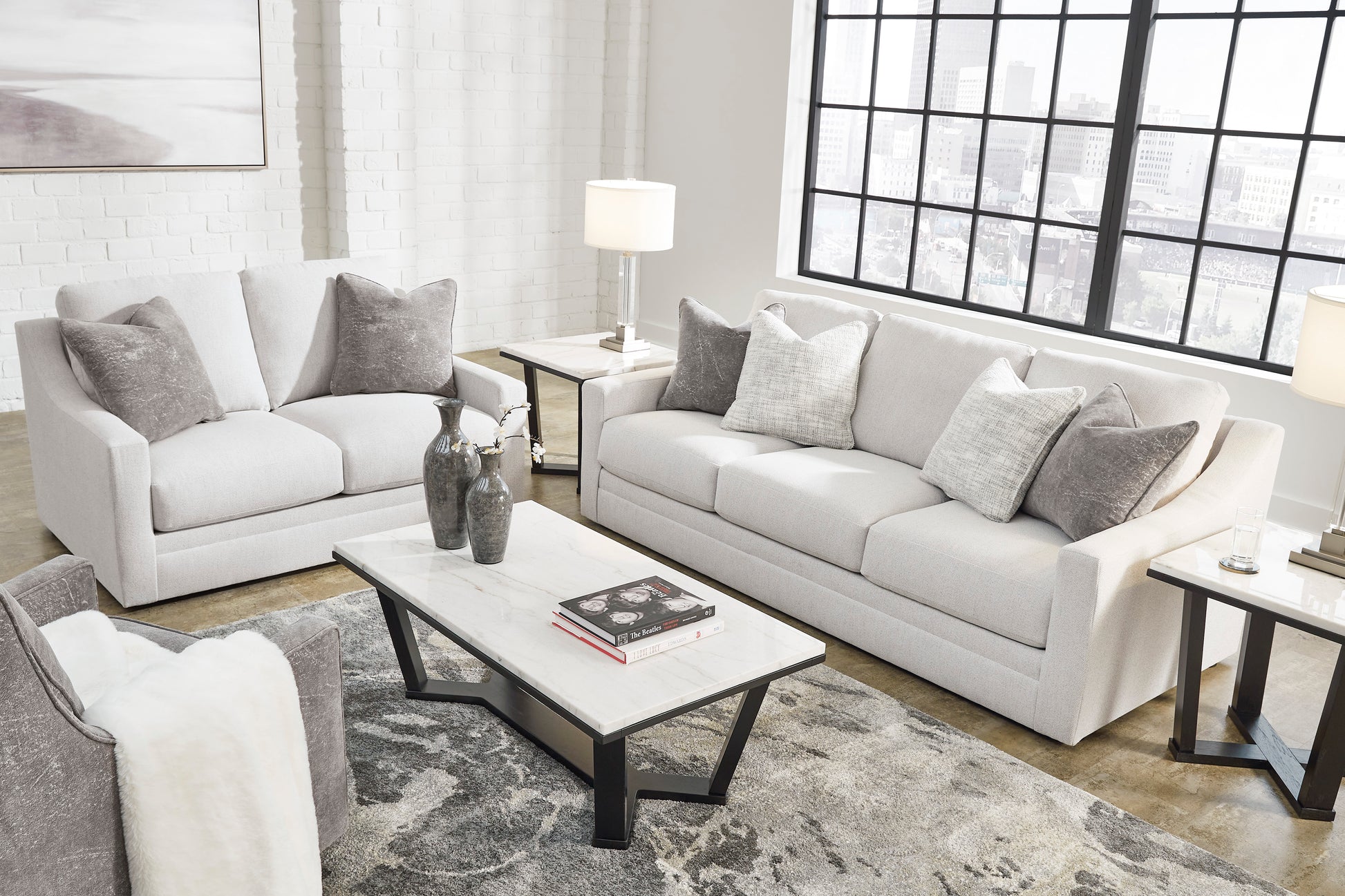 Clean lines and a streamlined silhouette define the architectural attitude of the Maitelynn Sofa set. Textured accent pillows in complementary colors add subtle contrast, while plush reversible cushions beckon your body to sit down, get comfy and relax completely.Corner-blocked frame