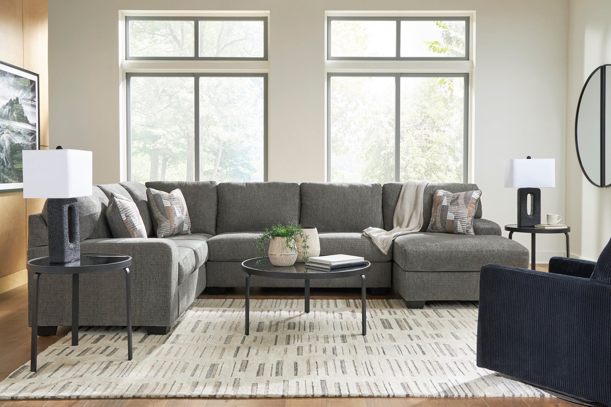 Why choose between classic comfort and modern design? The Newellen sectional with chaise welcomes day-to-day relaxation in style. Its dimensional, menswear-inspired upholstery brings a designer touch to the easygoing silhouette. Gear up for game night or settle in to stream your favorite show€”this sectional is an ideal supporting character for your living room hangs.