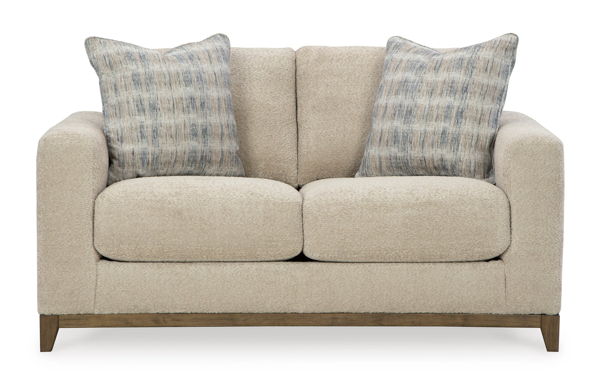 Serene style with a modern sensibility. Delight in the cozy, versatile embrace of this Sofa set. It takes an on-trend approach to irresistible texture and natural beauty, showcasing soft upholstery accented with a transitional wood trim. As refined as it is laid back, the Sofa also keeps comfort a priority with plush, thick seat cushions.Corner-blocked frame