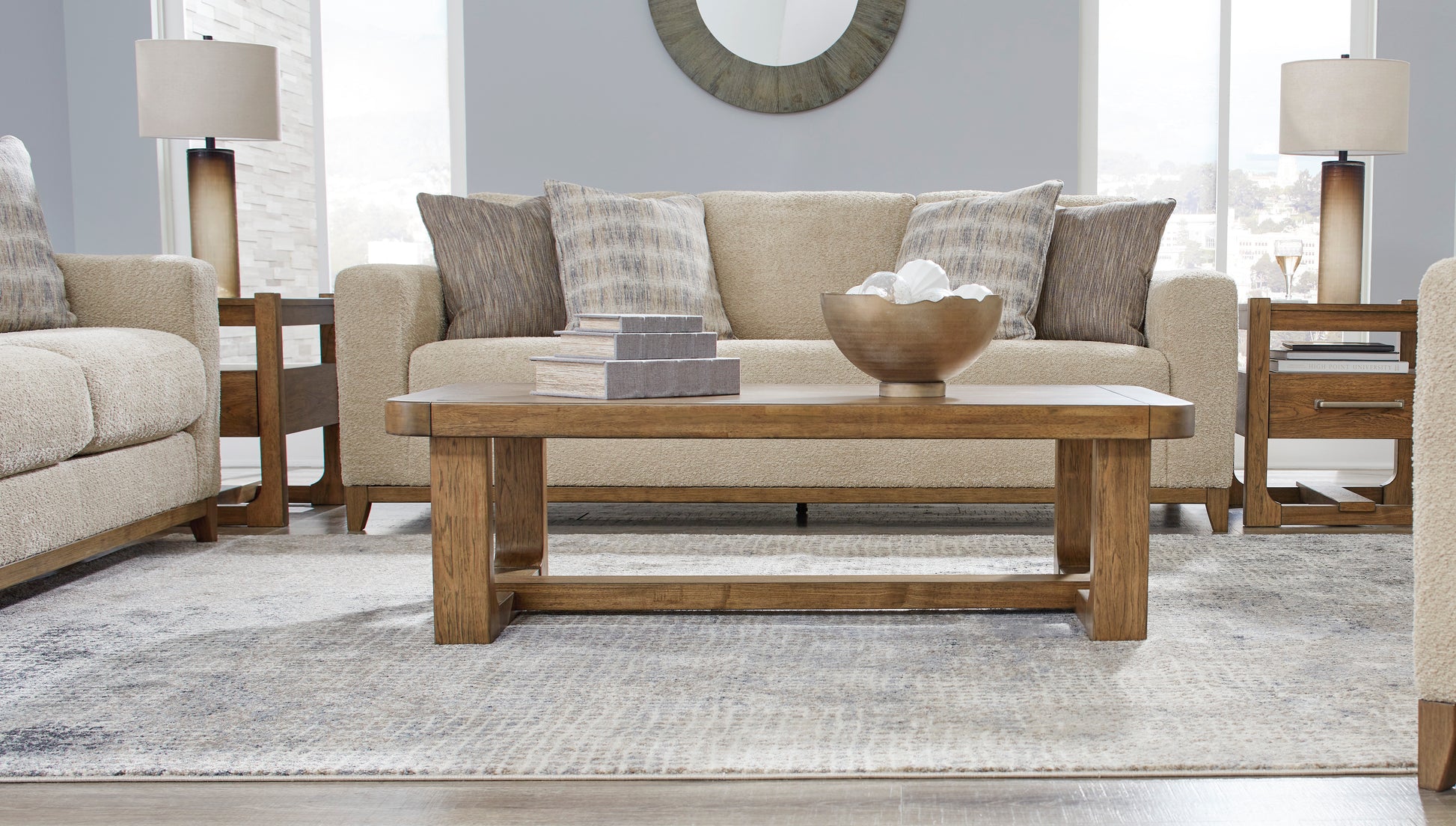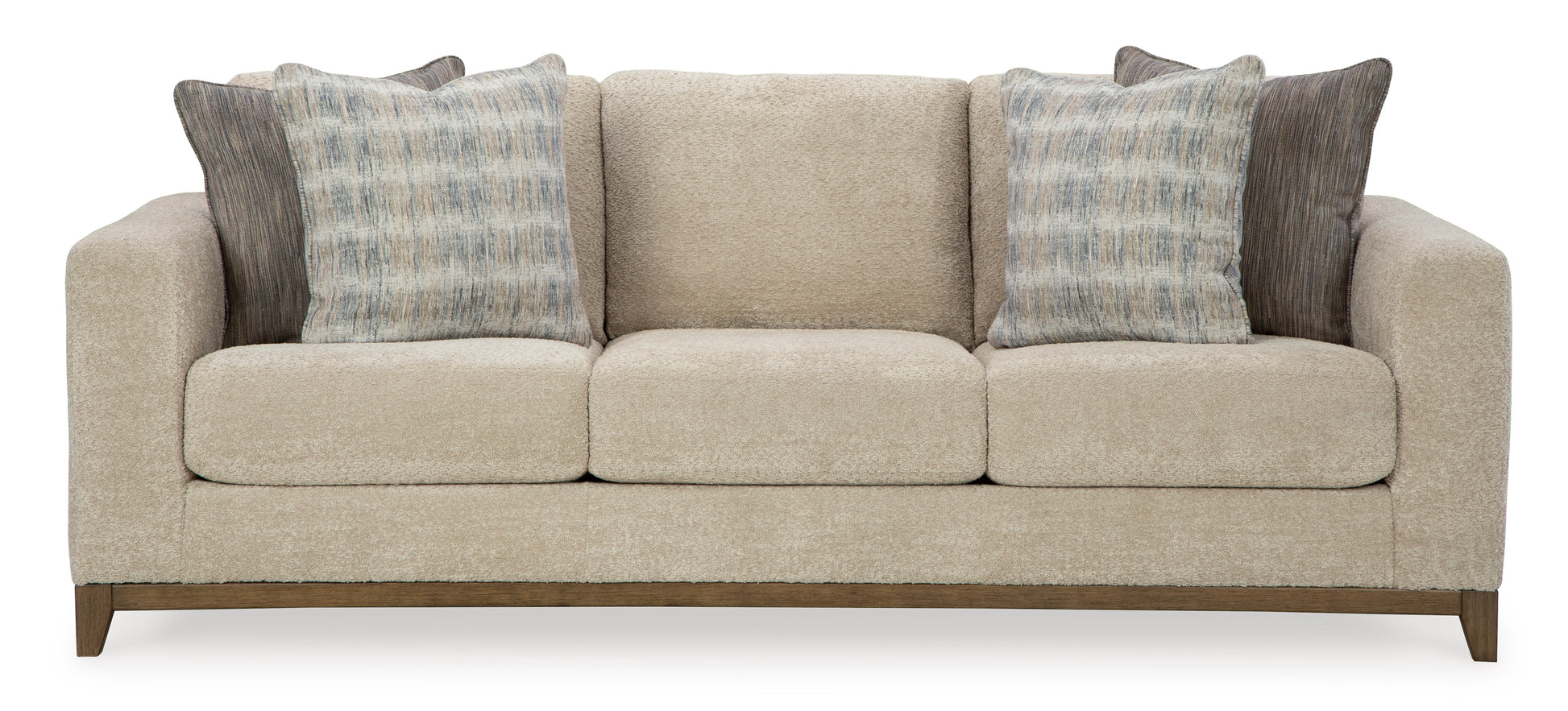 Serene style with a modern sensibility. Delight in the cozy, versatile embrace of this Sofa. It takes an on-trend approach to irresistible texture and natural beauty, showcasing soft upholstery accented with a transitional wood trim. As refined as it is laid back, the Sofa also keeps comfort a priority with plush, thick seat cushions.Corner-blocked frame