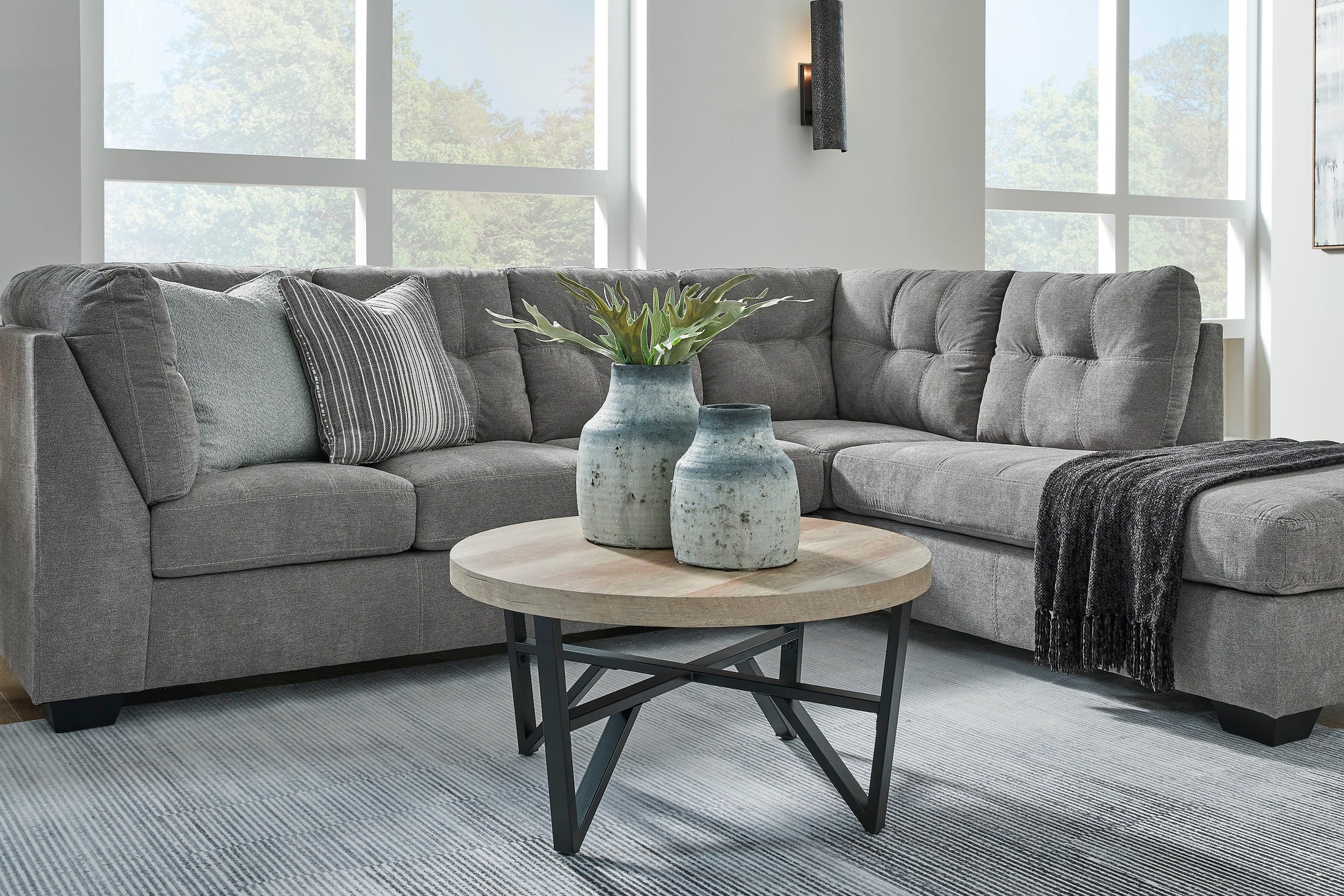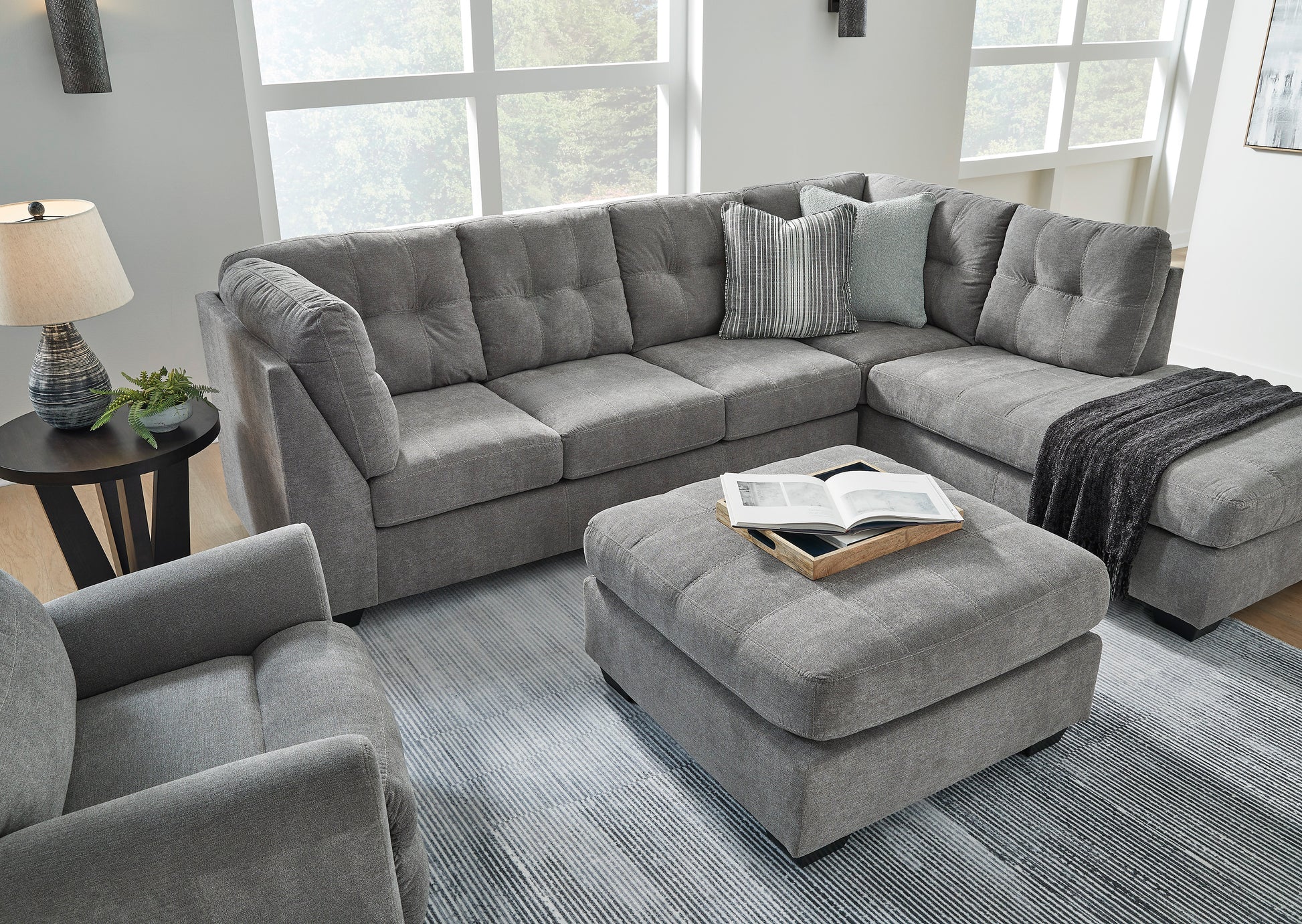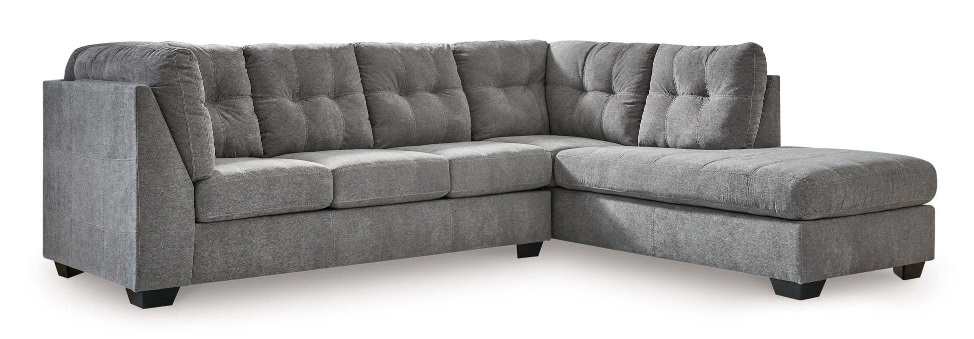 The Marrelton sectional with chaise takes a homey approach to high style. Its gray coloration has classic versatility, while a contemporary silhouette and stitched details keep the look totally on trend. And you can count on comfort€”the chaise invites you to kick back and stretch out.