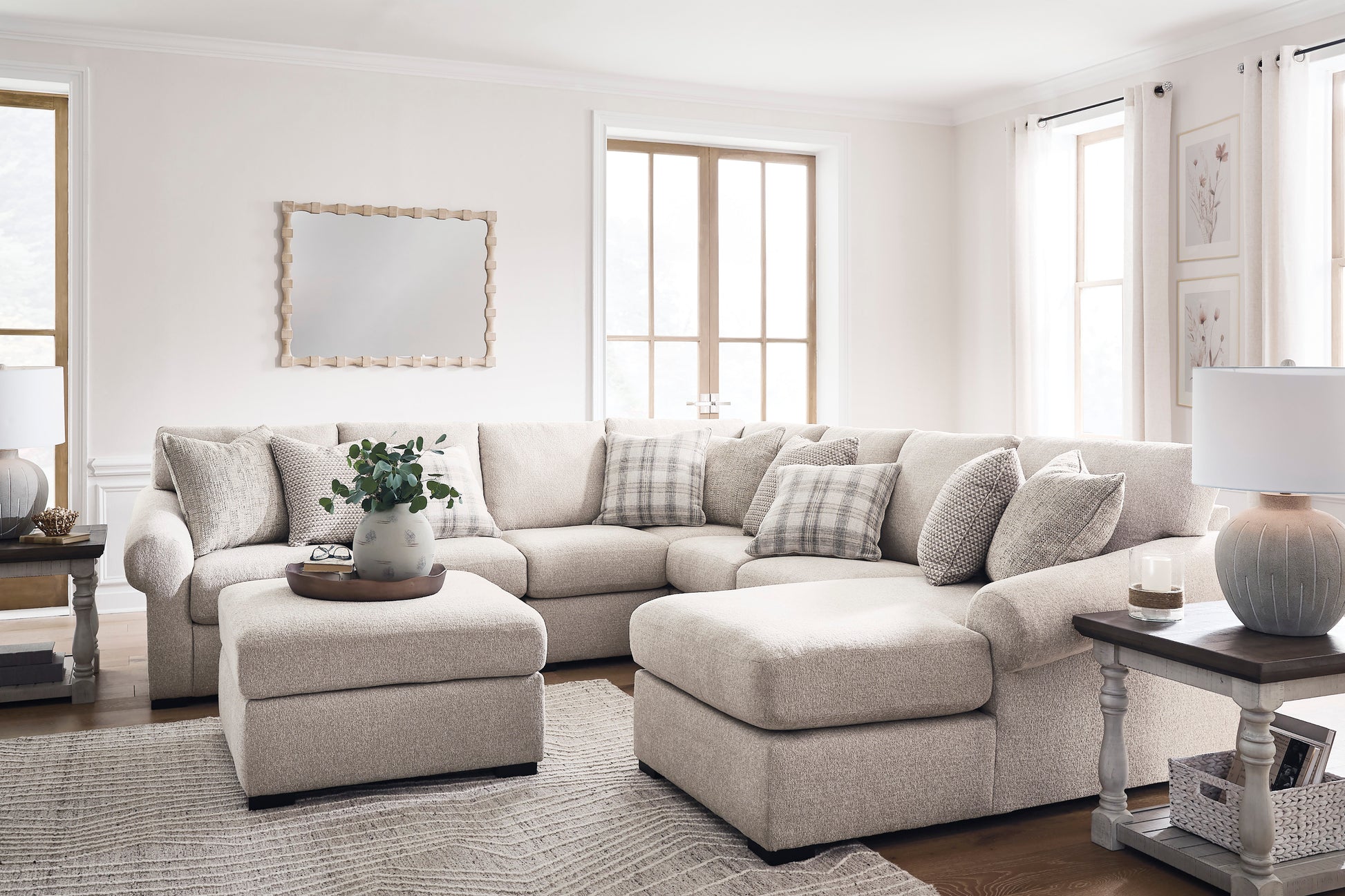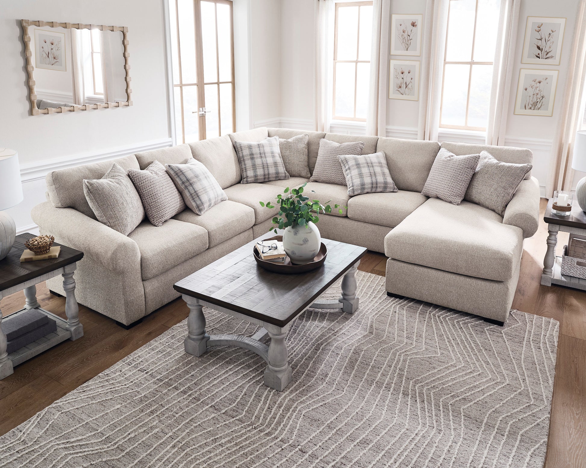 The Bridgemont sectional with chaise offers a fresh perspective on transitional style, blending contemporary and classic elements for a timeless look. Its soothing neutral upholstery has a subtle sophistication, while curved roll arms and plush reversible cushions provide a sense of everyday ease. Plus, the large scale of this seating means plenty of room to kick back solo or with your bestie. Assorted accent pillows add a wonderful layer of interest. Now that's universal style made simple.