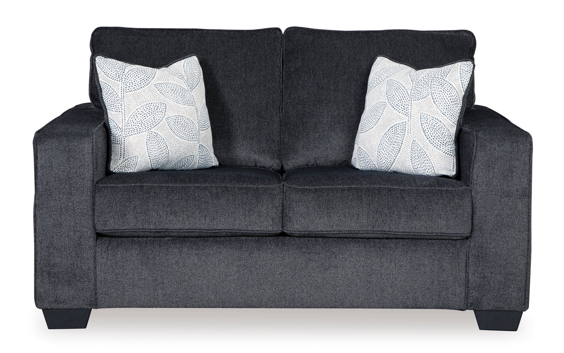 If style is the question, then the Altari Loveseat is the answer. Sporting clean lines and sleek track arms, the decidedly contemporary profile is enhanced with plump cushioning and a chenille-feel upholstery that's so pleasing to the touch. Sure to play well with so many color schemes, this Loveseat in slate gray includes a pair of understated floral pattern pillows for fashionably fresh appeal.Corner-blocked frame
