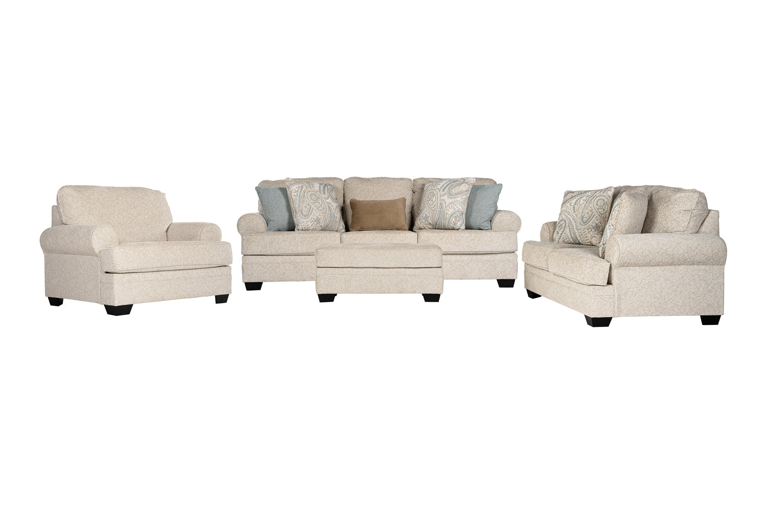 arms maintain the casual cool look. Vine motif pillows bring in a calm and steady piece of