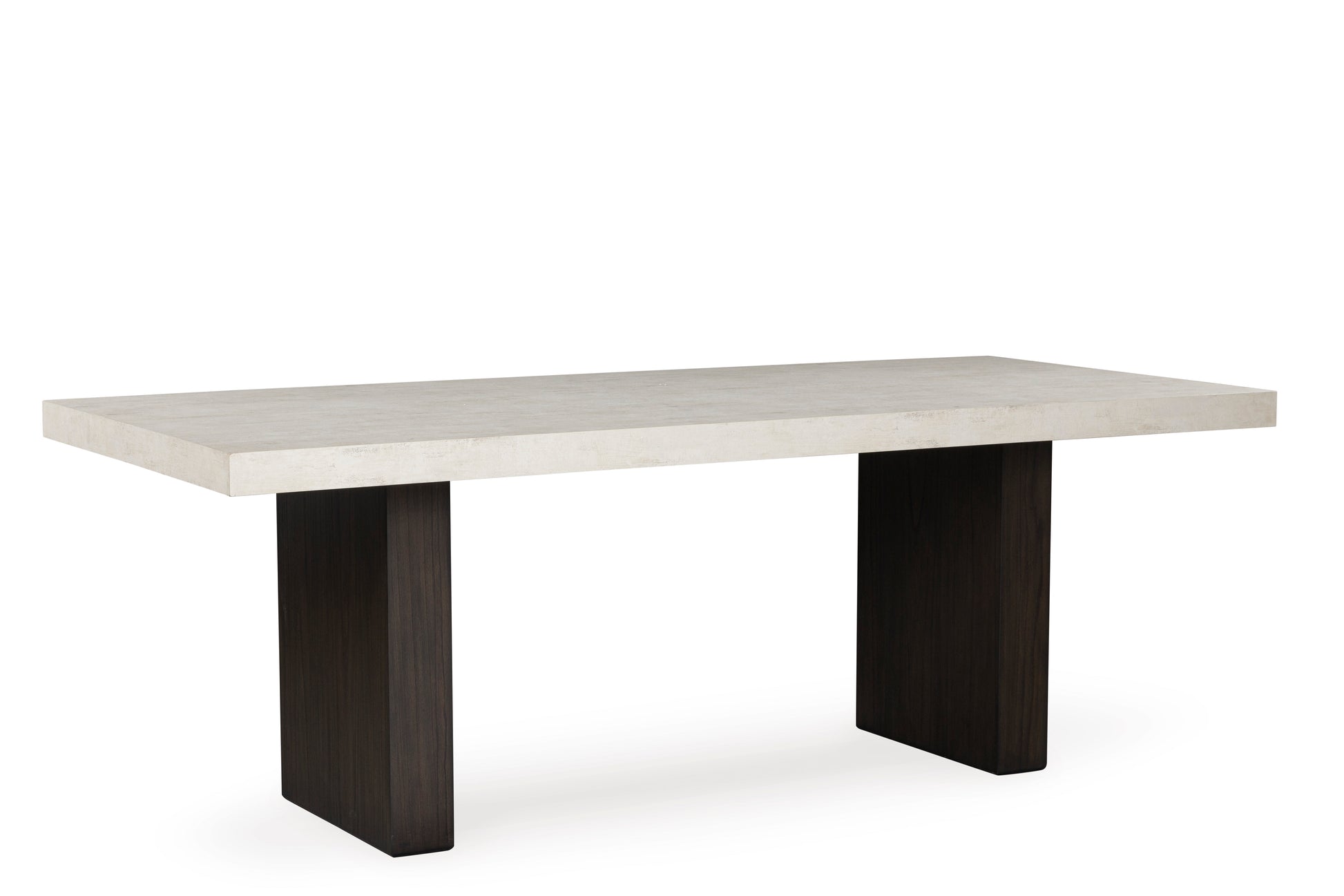 • Dining table features clean contemporary design with double plinth base and thick tabletop