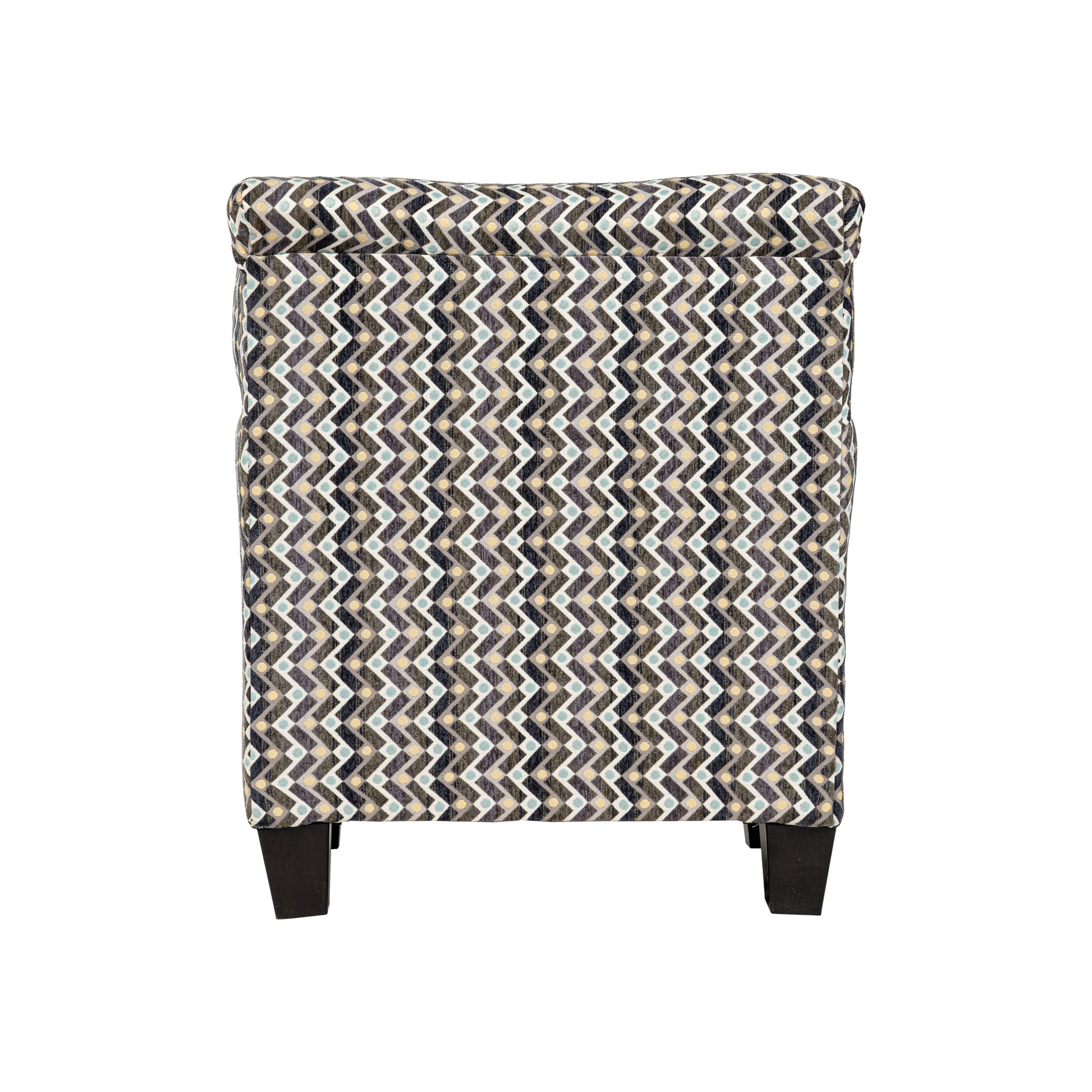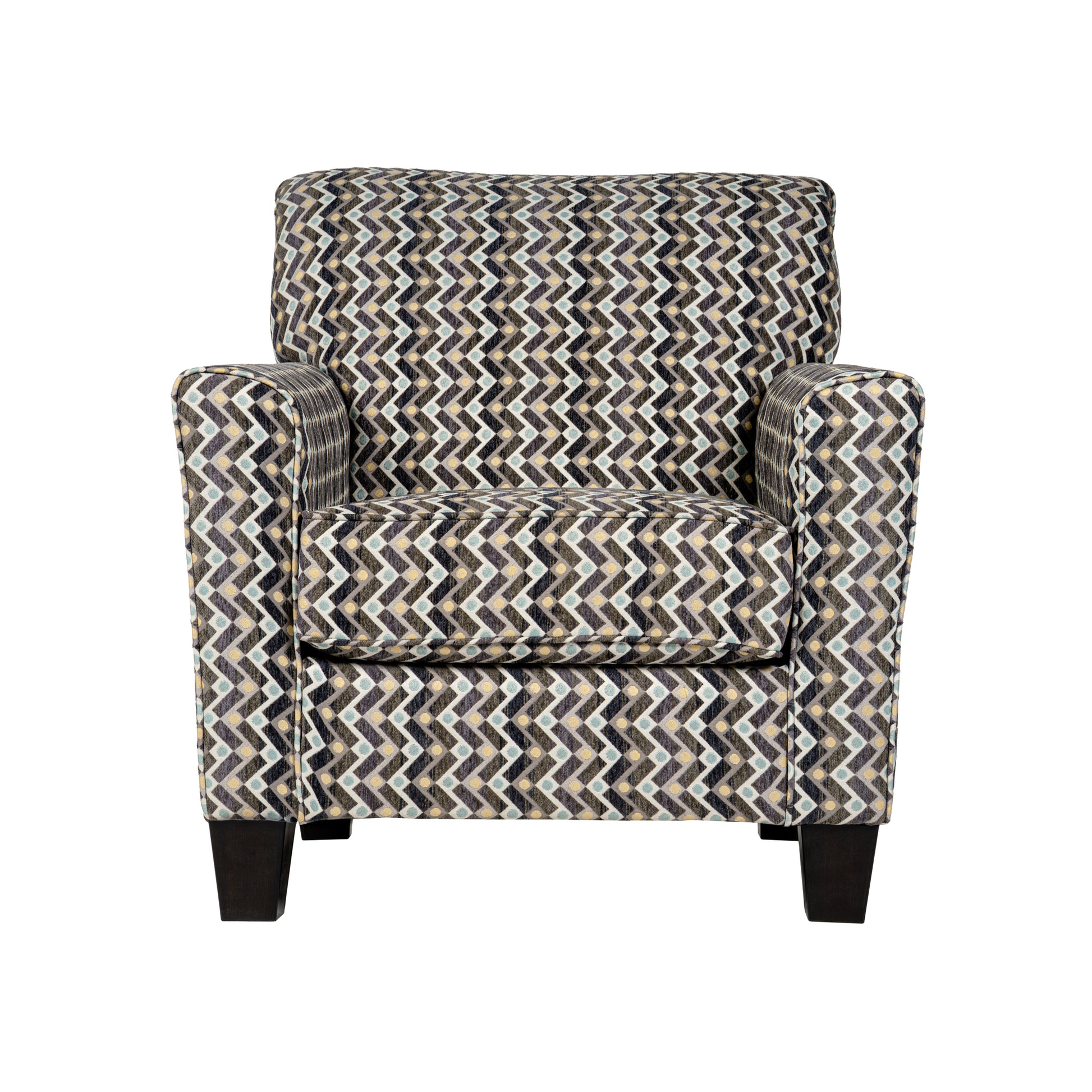 Description: The Alira accent chair has the corner on casual contemporary style and everyday comfort. Chic and subtly innovative, its colorful geometric upholstery is a forward-thinking take on cool hues. This simple, streamlined design is sure to appeal to your relaxed approach to modern flair. · Corner-blocked frame · Attached back and reversible seat cushion · High-quality foam cushions wrapped in poly fiber · Polyester upholstery · Exposed feet with faux wood finish · Platform foundation system resists sagging 3x better than spring system after 20,000 testing cycles by providing more even support · Smooth platform foundation maintains tight, wrinkle-free look without dips or sags that can occur over time with sinuous spring foundations